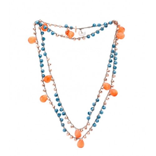 Collana lavorazione ad uncinetto con pietre sintetiche e goccie , chiusura con asola e perla naturale, elementi in bagnati in oro rosè . Lunghezza cm 80 da indossare doppio giro . Fatta a mano a Firenze