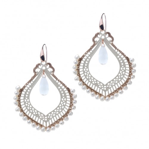 Orecchini base metallo smaltato con lavorazione uncinetto con perle e goccia sintetica . Gancio in argento 925 % bagnato in oro rosè . Fatti a mano a Firenze