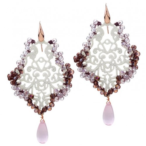 Orecchini base metallo smaltato con lavorazione uncinetto e pietre sintetiche . Gancio in argento 925 % bagnato in oro rosè . Fatti a mano a Firenze