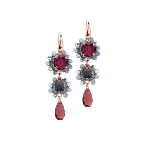 Orecchini con pietre incastonate , castoni in metallo bagnati in oro rosè , lavorati ad uncinetto e goccia . Gancio in argento 925 % bagnato in oro rosè . Fatti a mano a Firenze