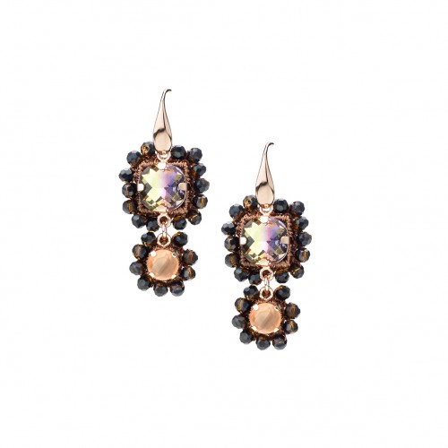 Orecchini con pietre incastonate , castoni in metallo bagnati in oro rosè , lavorati ad uncinetto con pietre . Gancio in argento 925 % bagnato in oro rosè . Fatti a mano a Firenze