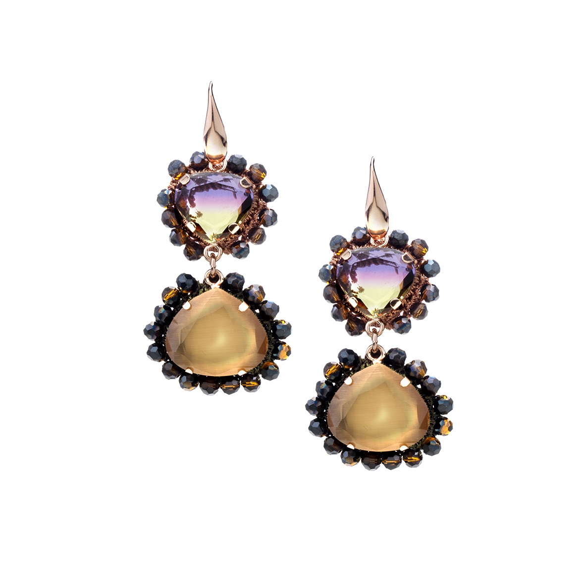 Orecchini con pietre incastonate , castoni in metallo bagnati in oro rosè , lavorati ad uncinetto co...