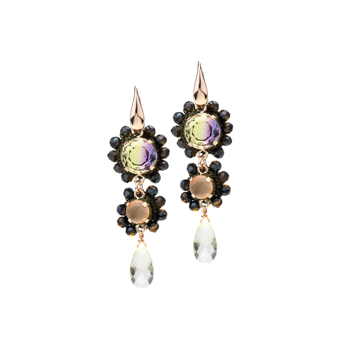 Orecchini con pietre incastonate , castoni in metallo bagnati in oro rosè , lavorati ad uncinetto e ...