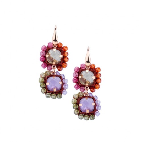 Orecchini con pietre incastonate , castoni in metallo bagnati in oro rosè , lavorati ad uncinetto con pietre . Gancio in argento 925 % bagnato in oro rosè . Fatti a mano a Firenze