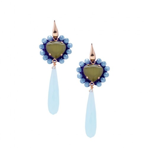 Orecchini con pietre incastonate , castoni in metallo bagnati in oro rosè , lavorati ad uncinetto e goccia . Gancio in argento 925 % bagnato in oro rosè . Fatti a mano a Firenze