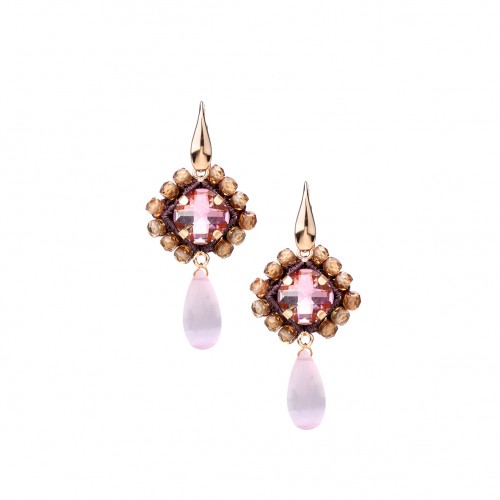 Orecchini con pietre incastonate , castoni in metallo bagnati in oro rosè , lavorati ad uncinetto e goccia . Gancio in argento 925 % bagnato in oro rosè . Fatti a mano a Firenze