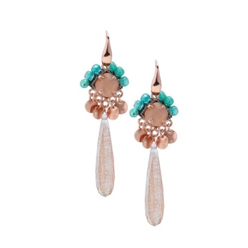 Orecchini con pietre incastonate , castoni in metallo bagnati in oro rosè , lavorati ad uncinetto e goccia . Gancio in argento 925 % bagnato in oro rosè . Fatti a mano a Firenze