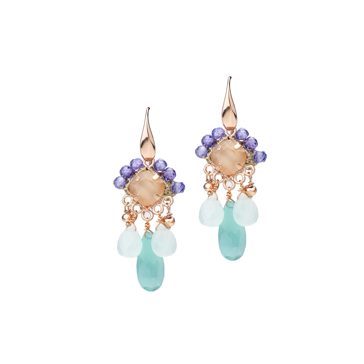 Orecchini con pietre incastonate ,castoni in metallo bagnati in oro rosè , lavorati ad uncinetto con pietre . Gancio in argento 925 % bagnato in oro rosè . Fatti a mano a Firenze