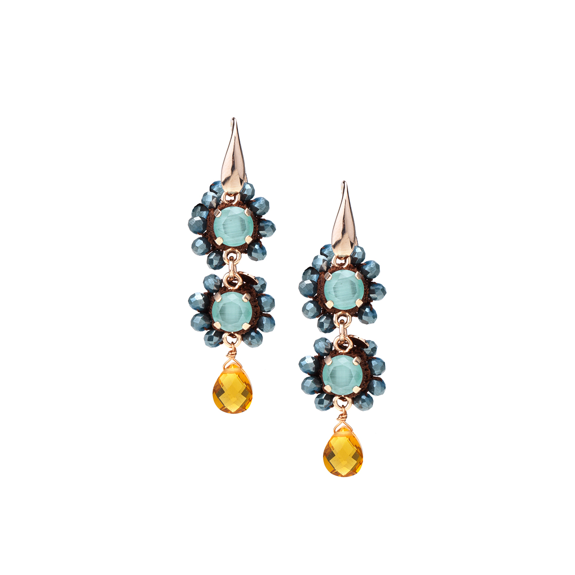 Orecchini con pietre incastonate ,castoni in metallo bagnati in oro rosè , lavorati ad uncinetto con pietre . Gancio in argento 925 % bagnato in oro rosè . Fatti a mano a Firenze