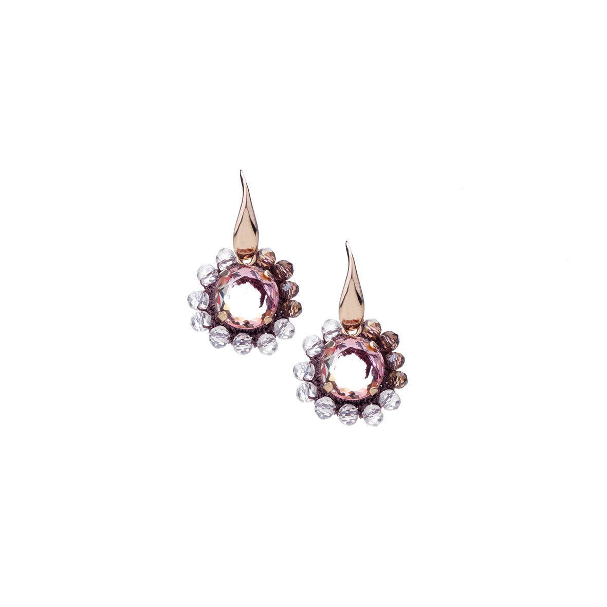 Orecchini con pietre incastonate , castoni in metallo bagnati in oro rosè , lavorati ad uncinetto co...