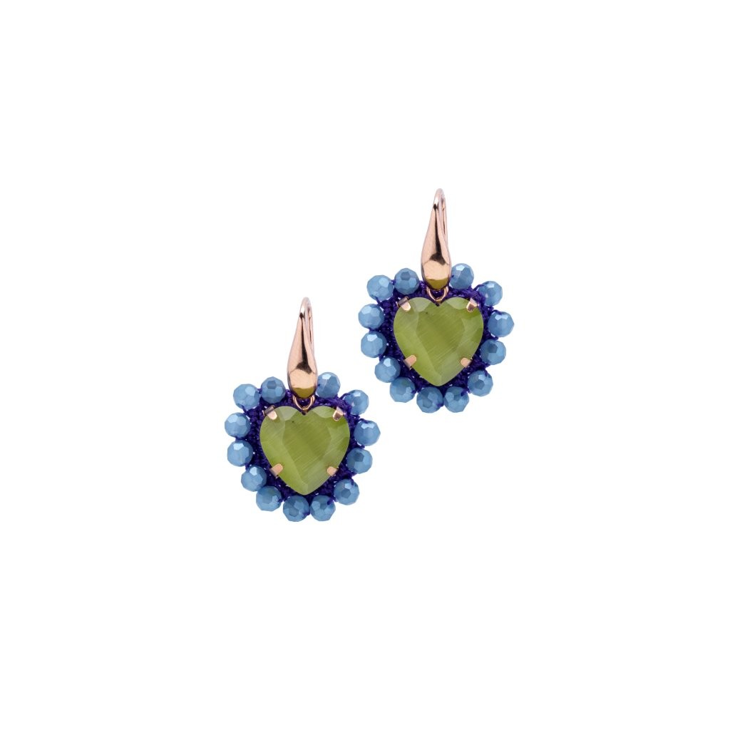 Orecchini con pietre incastonate ,castoni in metallo bagnati in oro rosè , lavorati ad uncinetto con pietre . Gancio in argento 925 % bagnato in oro rosè . Fatti a mano a Firenze